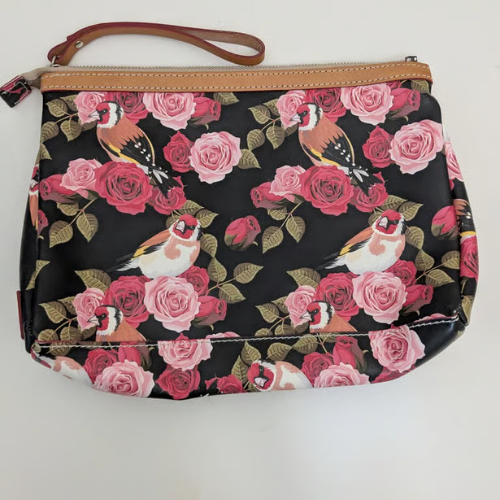 Elevate your accessory game with the SE Cavalcanti Made in Italy Genuine Leather Wristlet, a unique piece that blends Italian artistry with practical design. Featuring a striking floral and bird print against a black leather base, this wristlet offers both charm and sophistication. The red-lined interior includes card slots and a pocket, while the detachable wrist strap ensures easy versatility.